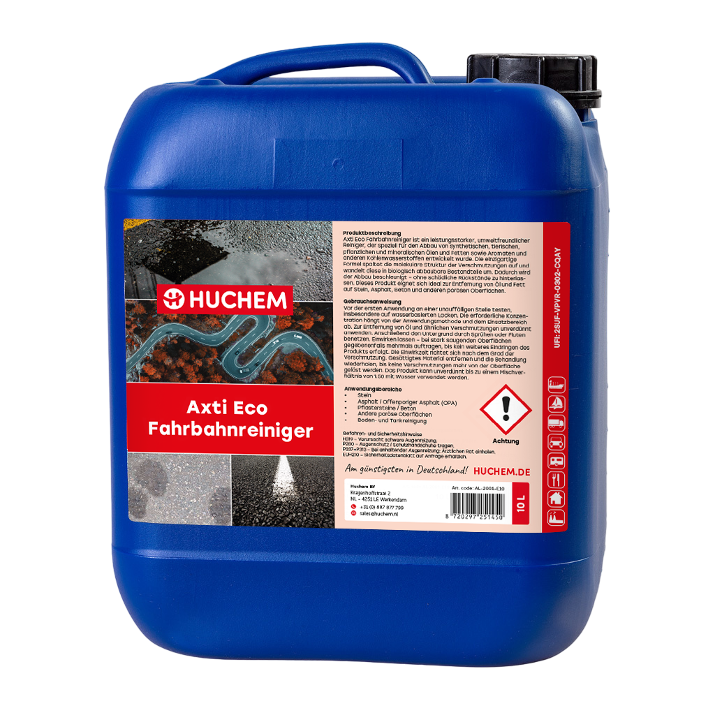 Der Fahrbahnreiniger ECO wurde speziell zur Zersetzung von synthetischen, tierischen, pflanzlichen und mineralischen Ölen und Fetten, Aromaten und anderen Kohlenwasserstoffen entwickelt. Die molekulare Struktur der Verschmutzung wird aufgebrochen und in eine biologisch abbaubare Masse umgewandelt. Dadurch wird der Abbau stark gefördert – ganz ohne schädliche Rückstände. Geeignet zur Entfernung von Öl aus Stein, Asphalt, Beton und anderen porösen Oberflächen sowie für Erd- und Tankreinigungen. Auch geeignet für die Ultraschallreinigung. Die Tenside sind laut OECD-Test zu über 90 % biologisch abbaubar.