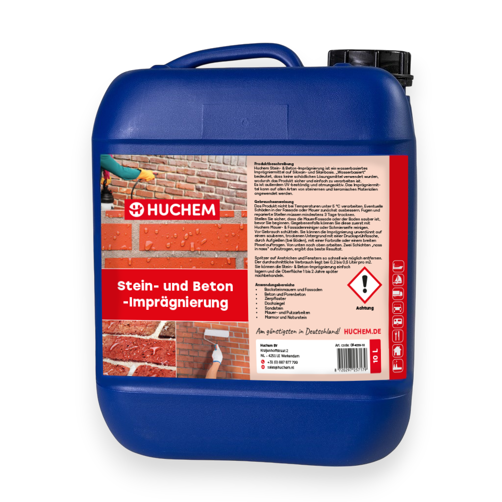 Huchem Stein- und Betonimprägnierung ist ein wasserbasiertes Imprägniermittel auf Basis von Siloxanen und Silanen. Wasserbasiert bedeutet, dass keine schädlichen Lösungsmittel verwendet wurden, wodurch das Produkt sicher und einfach zu verarbeiten ist. Außerdem ist es beständig gegen UV-Strahlung und atmungsaktiv.