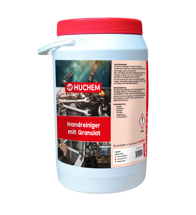 Huchem Handreiniger mit Granulat (Garagenseife) ist eine milde Reinigungscrème für hartnäckige Verschmutzung. Speziell für Profis in Schifffahrt, Transport und auf Bohrinseln.
