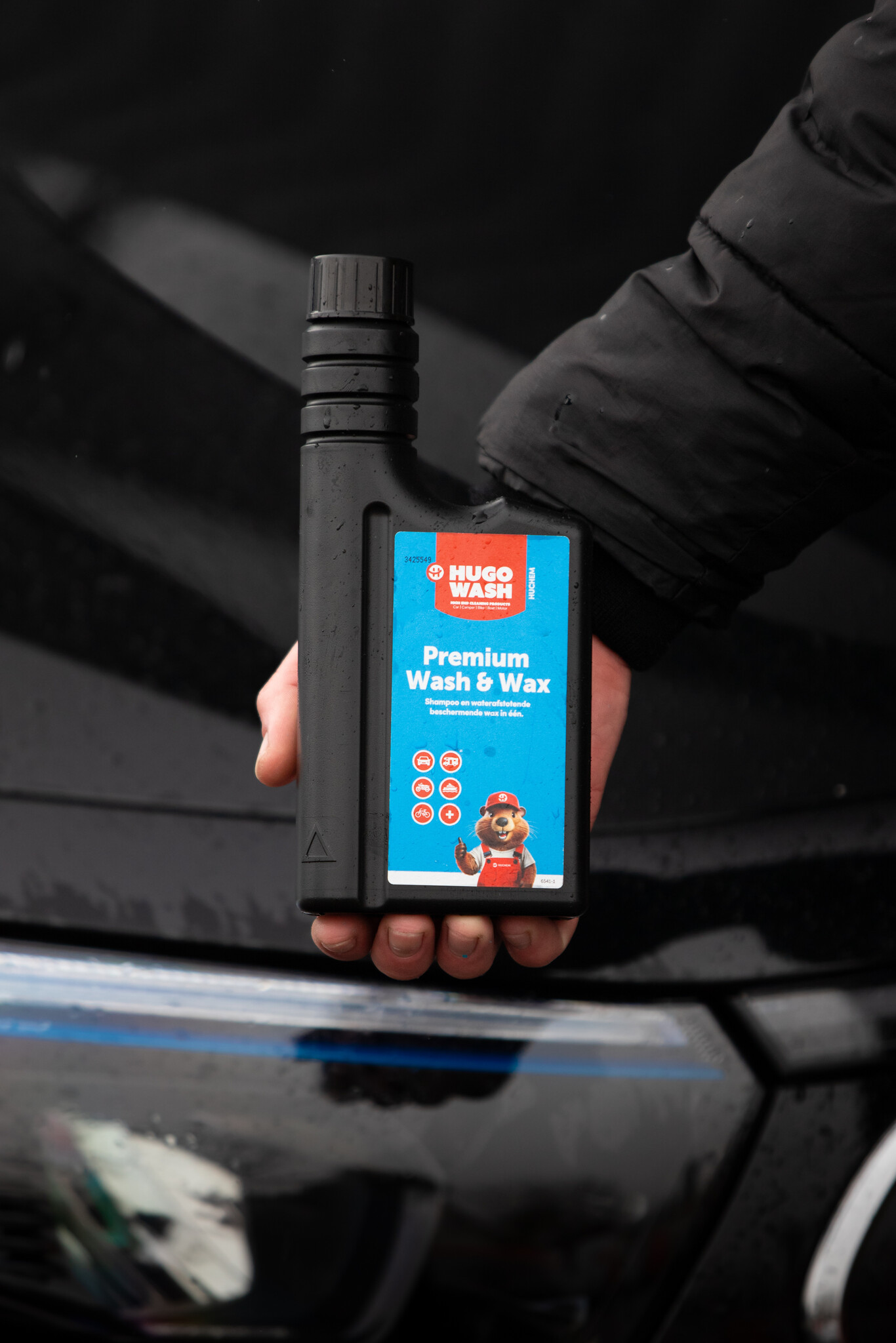 Kraftvolles Shampoo mit wasserabweisendem Wachs. Hugo Wasch Premium Wash & Wax reinigt, schützt und verleiht Autos, Motorrädern, Booten und Wohnwagen tiefen Glanz.
