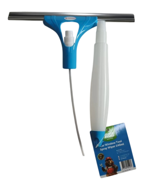 Das robuste Gehäuse aus Kunststoff liegt komfortabel in der Hand und ist mit einer langlebigen Gummilippe ausgestattet, die Schmutz, Staub und Flecken mühelos entfernt, ohne Streifen zu hinterlassen. Die nachfüllbare 140 ml Sprühflasche eignet sich perfekt für Scheibenreiniger oder Wasser und lässt sich bequem mit einer Hand bedienen.