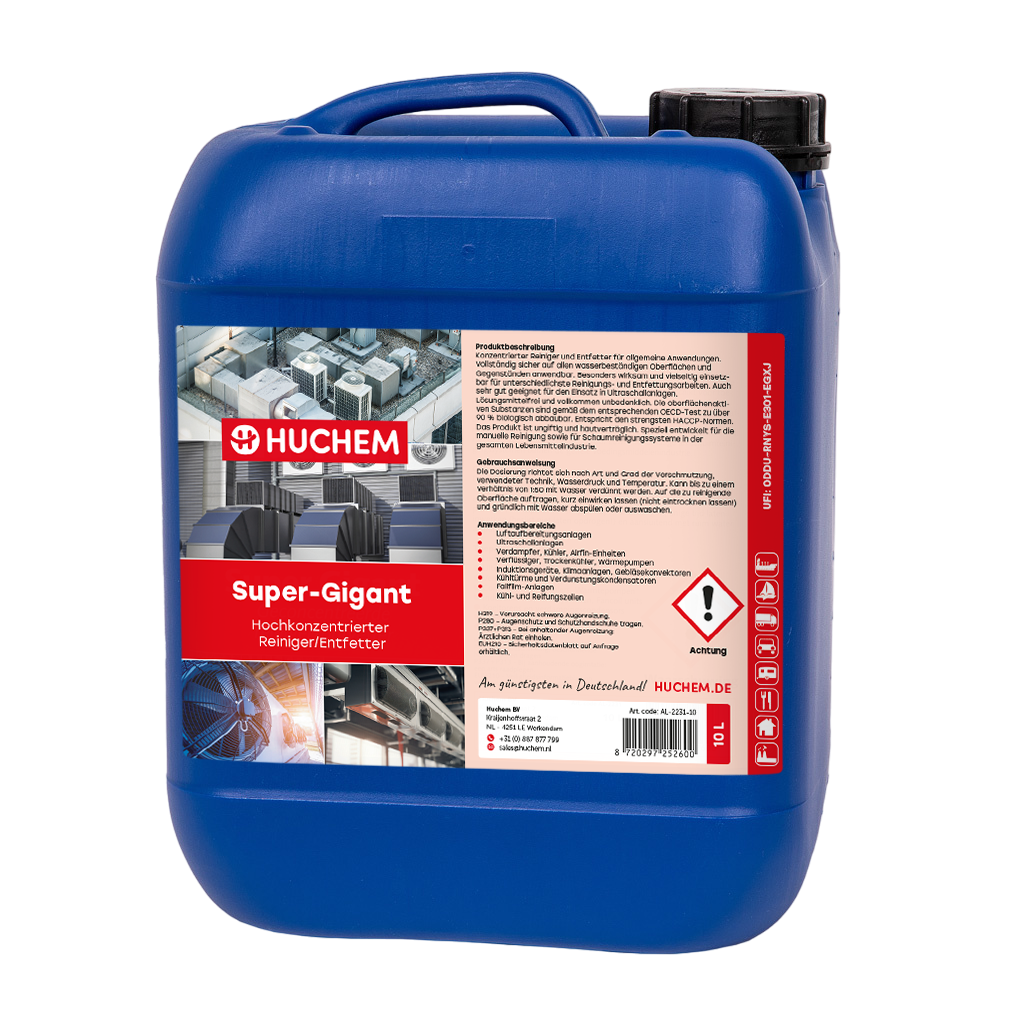 Sicher anwendbar auf allen wasserbeständigen Oberflächen und Objekten. Besonders wirksam und vielseitig einsetzbar bei Reinigungs- und Entfettungsarbeiten. Auch hervorragend geeignet für den Einsatz in Ultraschallanlagen. Lösungsmittelfrei und vollkommen unbedenklich. Die enthaltenen Tenside sind zu über 90 % biologisch abbaubar gemäß OECD-Testverfahren. Super Gigant Technical ist geruchlos, farblos und gering schäumend. Entspricht den strengsten HACCP-Richtlinien. Das Produkt ist nicht toxisch und hautverträglich. Entwickelt für manuelle und Schaumanwendungen in der gesamten Lebensmittelindustrie.